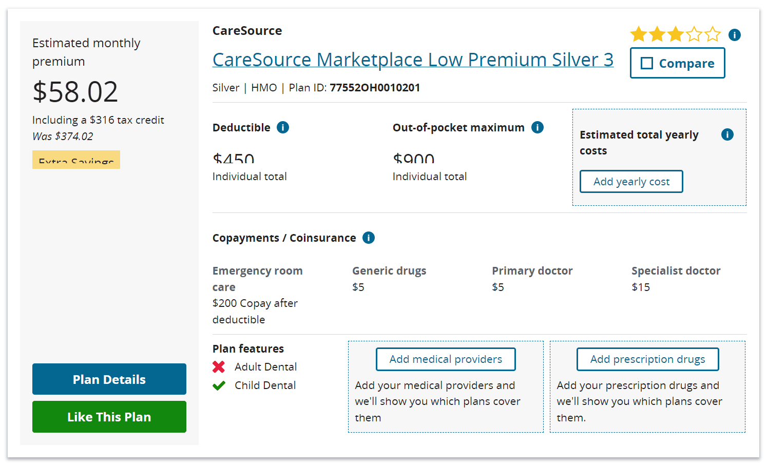 | 5 | CareSource | 43614 / Toledo | Mujer / 32 años Marido / 35 años Hijo / 5 años | $32000 / $676.75 (Bronze) $827.52 (Silver) | HMO | $0.00 / Ver CareSource-Bronze-Mujer-Marido-Niño-Toledo | $128.52 / Ver CareSource-Silver-Mujer-Marido-Niño-Toledo |